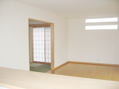 収納スペースが建物全体の12パーセントの広さを占める収納優良住宅です。まず、玄関に取り付けられた引戸を開けると1坪もの広さのある土間仕様のシューズクロークがあります。ここにも玄関框を取り付けたことで直接家へ出入りできる便利なウォークスルー収納となりました。また、主寝室には3帖の広さのあるワイドなウォークインクローゼットを設けました。ご家族が集まる場であるLDK。キッチンは、対面型の上部をフルオープンにして家事をしながら家族と顔を見て対話できる「コミニュケーションキッチン」です。LDKと隣接する和室の戸襖には2枚引込戸を採用。開け放つと広々とした一体感のある空間となります。