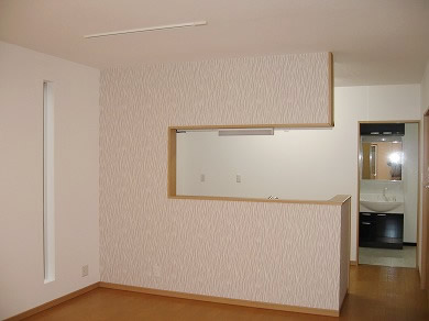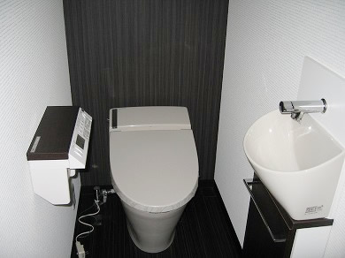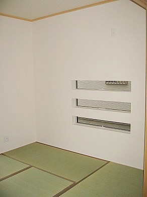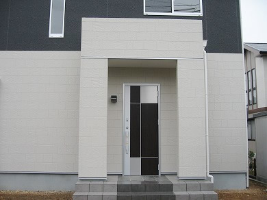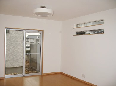 モノトーンを基調としたシンプルモダンでスタイリッシュな外観です。 水廻りの住宅設備もモノトーンで統一しています。 LDKの大型家電用の壁面には、横長のスリット窓を高位置にレイアウトして光と風を取りこみます。 和室には3本の横長のスリット窓を少し低い位置に配置し、座位から見える景色と光を取り入れます。 収納スペースも充分に確保した住みやすさとデザインの両方を兼ね備えたお住まいです。