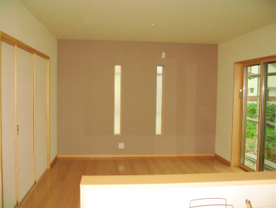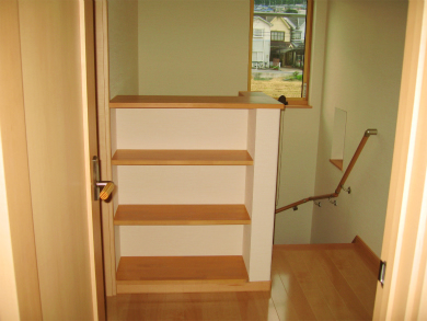 木目を基調に「ぬくもり」のある家ができました。 LDKには、縦に細長いスリット型の窓。お洒落感と採光の両方が叶ったLDKです。 また、階段の上りきった所には、本棚が設置! 家族共通の階段スペースで、絵本を読んでいる“ほのぼのとした光景”が浮かんできます。