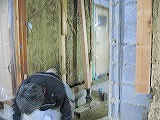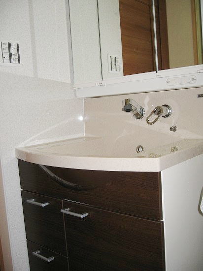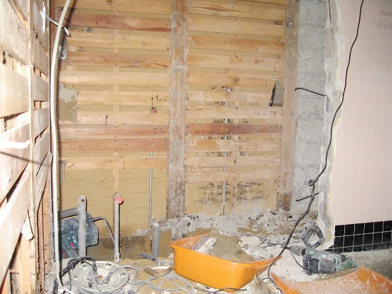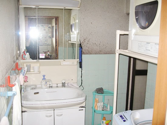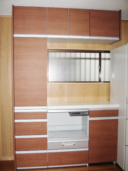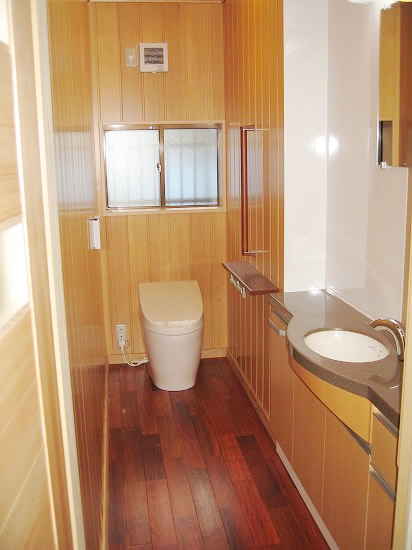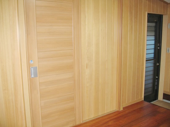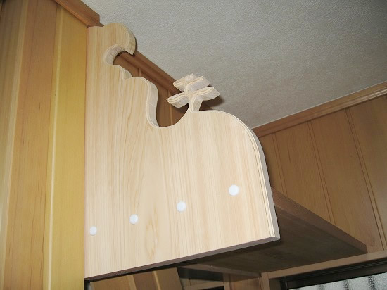 キッチン、バス、洗面所、トイレと水廻り中心のリフォーム工事です。解体してみると、バス・洗面所・トイレの土台柱が湿気で腐っていましたので、根接ぎ工事を施しました。悪い部分を全て撤去して、新しい柱を設置しました。施工後は、水栓廻りをキッチンパネル貼りにして湿気を防止しています。フロアは花梨、壁はアメリカンヘムロックの共にムク材を使っています。すべて無節の柾目になっています。 LDKに設置された神棚は、大工による繊細な細工が施されています。