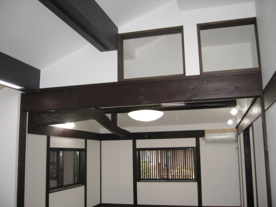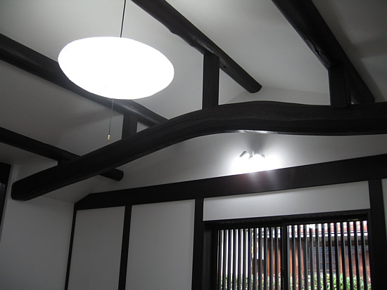 LDKは天井高を高くとれるよう勾配天井にしました。長年、天井裏からお宅を支えてきた梁・桁を、美しく磨き上げてその姿を見せることでお部屋のアクセントとしました。